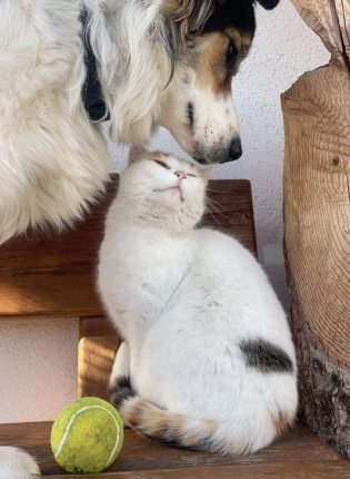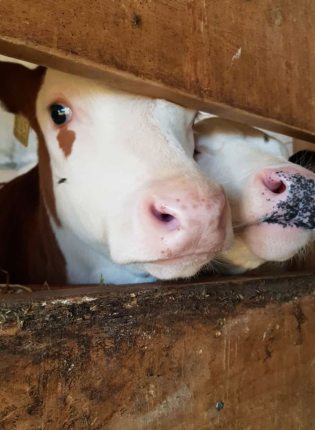 Freuen sich immer über Streicheleinheiten. Auf unserem Hof wachsen Kühe, Kälber, Ziegen, Enten, Hühner, Hasen, Katzen und natürlich unser Hund Nelly liebevoll auf.
